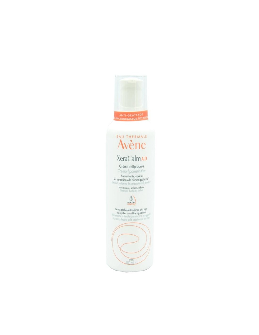 Avene Xeracalm A.D Crema Relipidizante 400 ml: alivia las pieles muy secas con tendencia a la dermatitis atópica y al picor gracias a la combinación de activos excepcionales seleccionados por su eficacia y seguridad. I-modulia®, el primer activo posbiótico derivado del agua termal de Avène, reduce el picor, estimula las defensas de la piel y combate la irritación. Los Cer-omega, lípidos similares a los de la piel, actúan sobre la sequedad y restauran la barrera cutánea. Gracias a la Cosmética Estéril®, una tecnología única que mantiene el producto estéril durante todo su uso, y un envase con dispensador totalmente hermético, este tratamiento de alto rendimiento garantiza la seguridad y el respeto óptimo de la piel y el microbioma cutáneo. Sin conservantes, sin perfume, no comedogénica y desarrollada para reducir el riesgo de reacciones alérgicas, la Crema relipidizante XeraCalm A.D es ideal para la piel de bebés, niños y adultos.