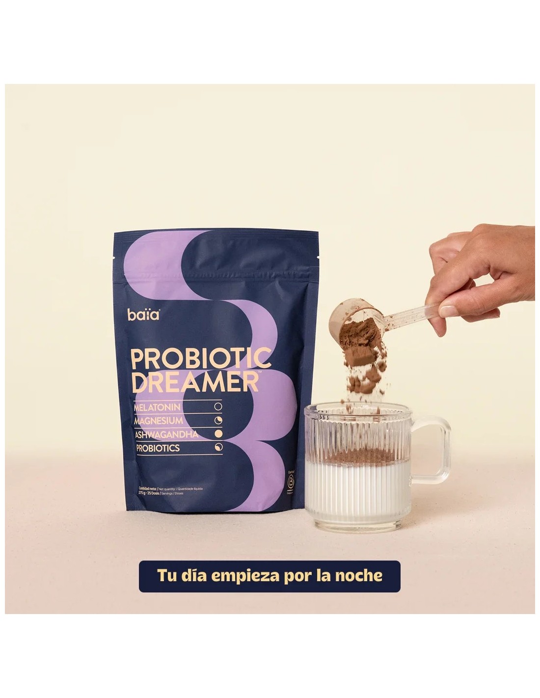 Contiene: Probiótico inactivado Lactobacillus gasseri CP2305® Melatonina vegetal (Melostacio™) extraída del pistacho Magnesio en un complejo único de sales de acetil taurato (ATA Mg®️) y citrato Extracto de ashwagandha (KSM-66®) Fibra prebiótica de inulina con FOS (Orafti®) de achicoria Complemento alimenticio en polvo a base de cacao, algarrobo, extractos vegetales, magnesio, fructooligosacáridos y microorganismos probióticos.