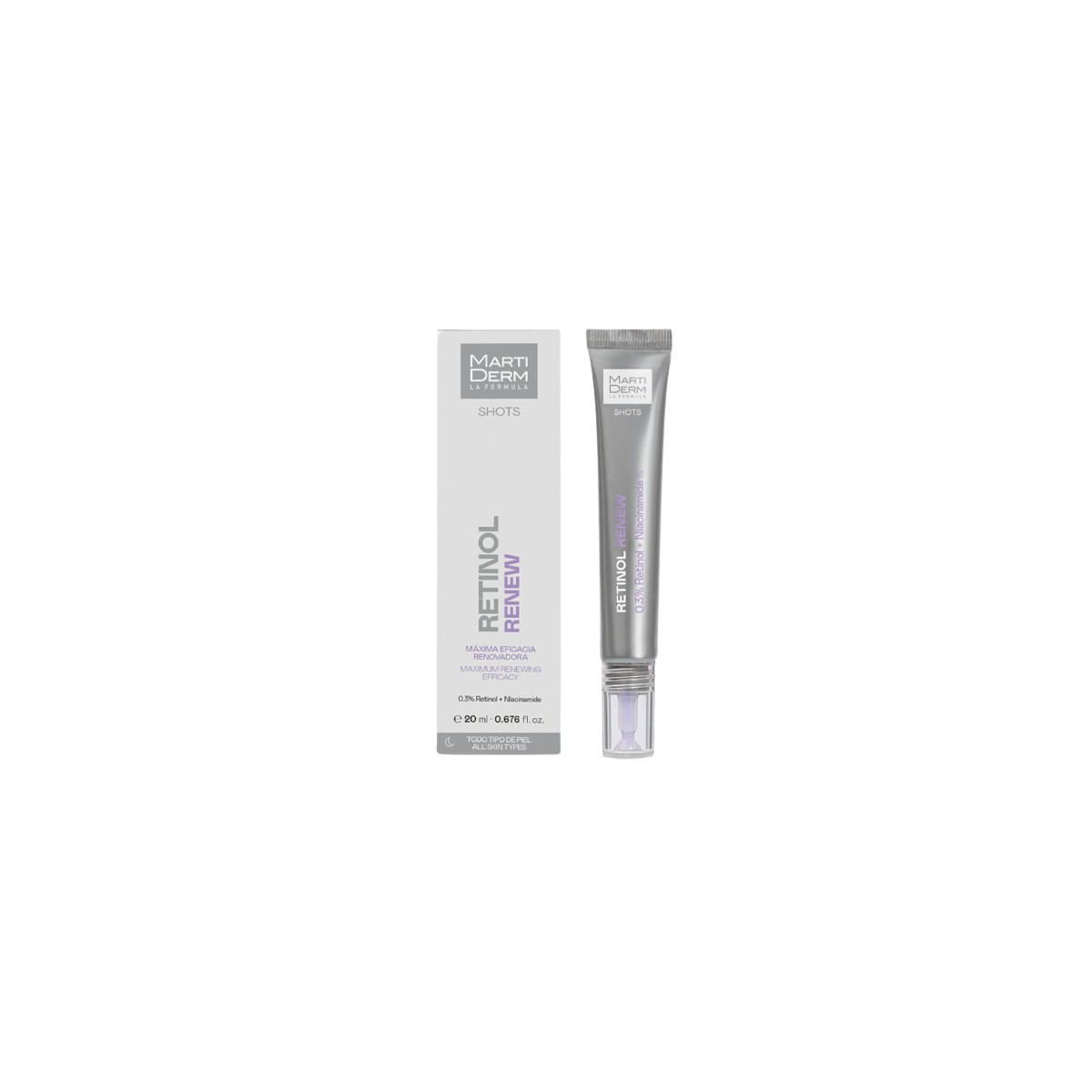 Martiderm Shot Retinol Renew 20 ml: Bálsamo fundente que contiene un 0,3% de retinol puro que, en sinergia con la niacinamida, forma un potente complejo renovador que ayuda a mejorar la apariencia de arrugas y líneas de expresión, así como minimizar manchas e imperfecciones. Consigue una piel más uniforme, suave y lisa. Sin residuo graso ni sensación pegajosa.