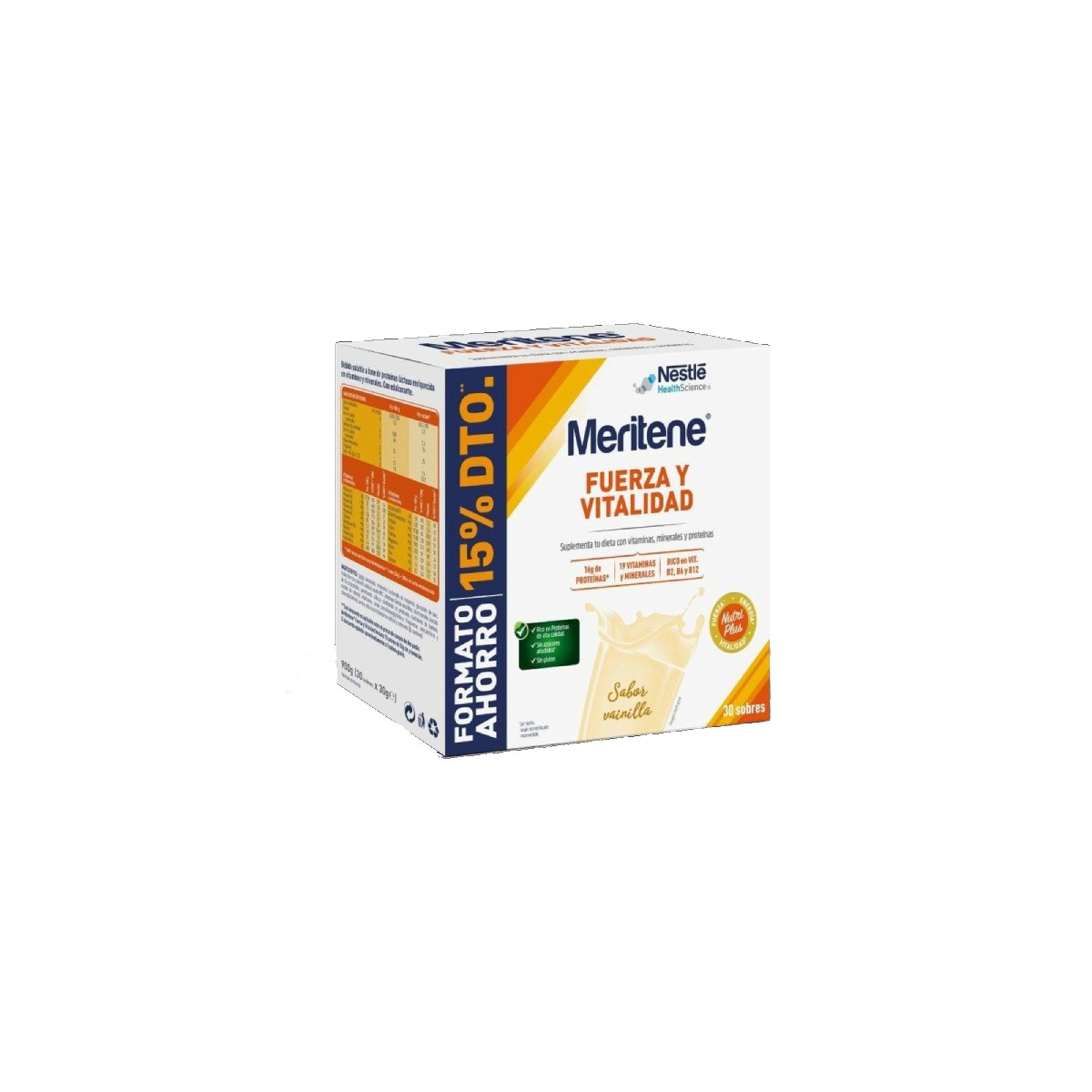 Meritene® Fuerza y Vitalidad es una solución nutricional en formato polvo o bebible listo para tomar. Su fórmula NutriPlus contiene proteínas de alta calidad, 19 minerals y vitaminas (entre las cuales se encuentran la vitamina B2, vitamina B6, vitamina B12, vitamina C). Los ingredientes de Meritene® Fuerza y Vitalidad permiten suplementar la dieta, contribuyen a disminuir el cansancio y la fatiga y ayudan al funcionamiento normal del sistema inmunológico.