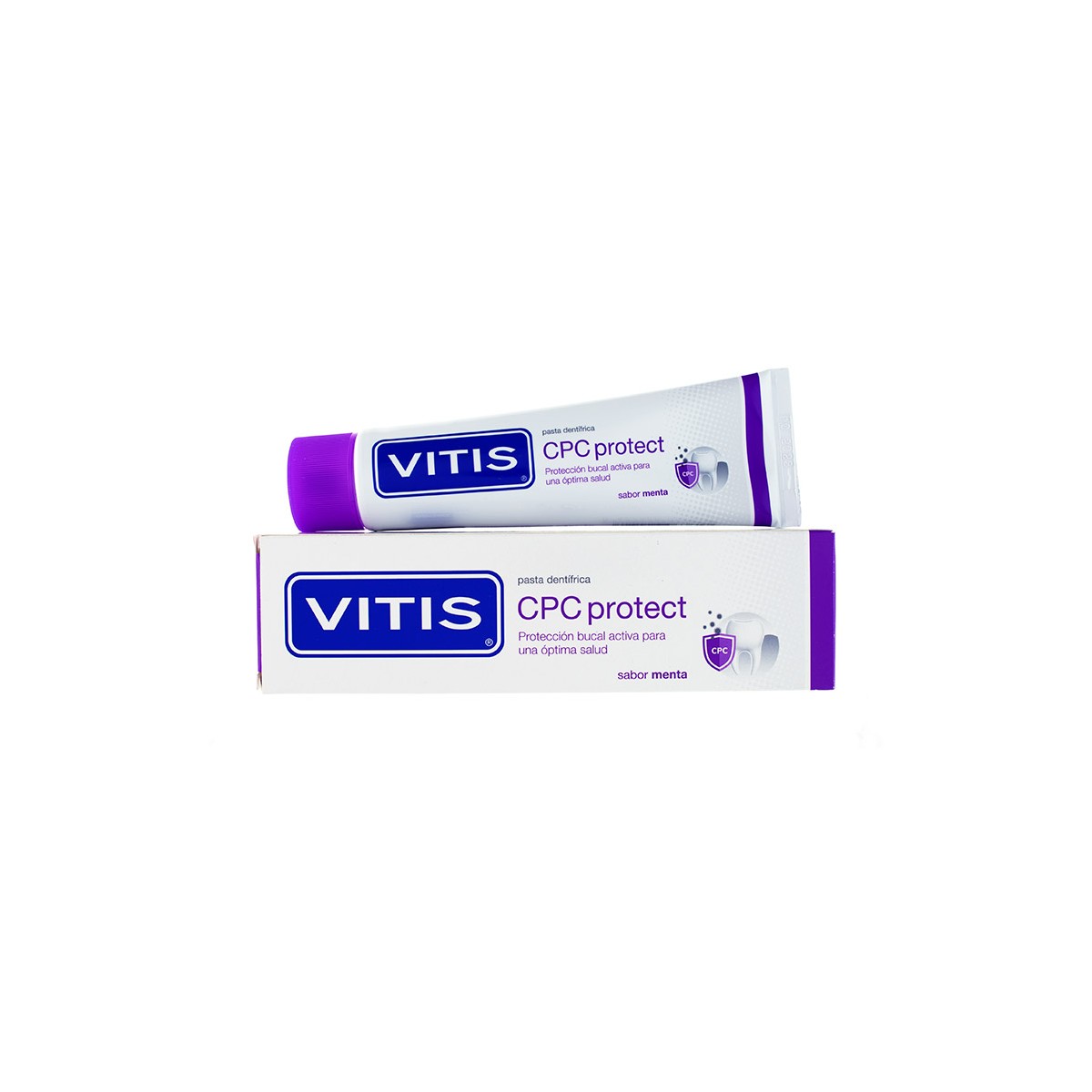 Pasta Dental Vitis CPC Protect 100 ml: VITIS CPC protect proporciona un cuidado diario y una protección bucal activa para una óptima salud. Ayuda a prevenir la formación de placa dental y reducir su acumulación y a la prevención de caries dental. Contiene CPC 0.14% y fluoruro sódico (1450ppm ion flúor).