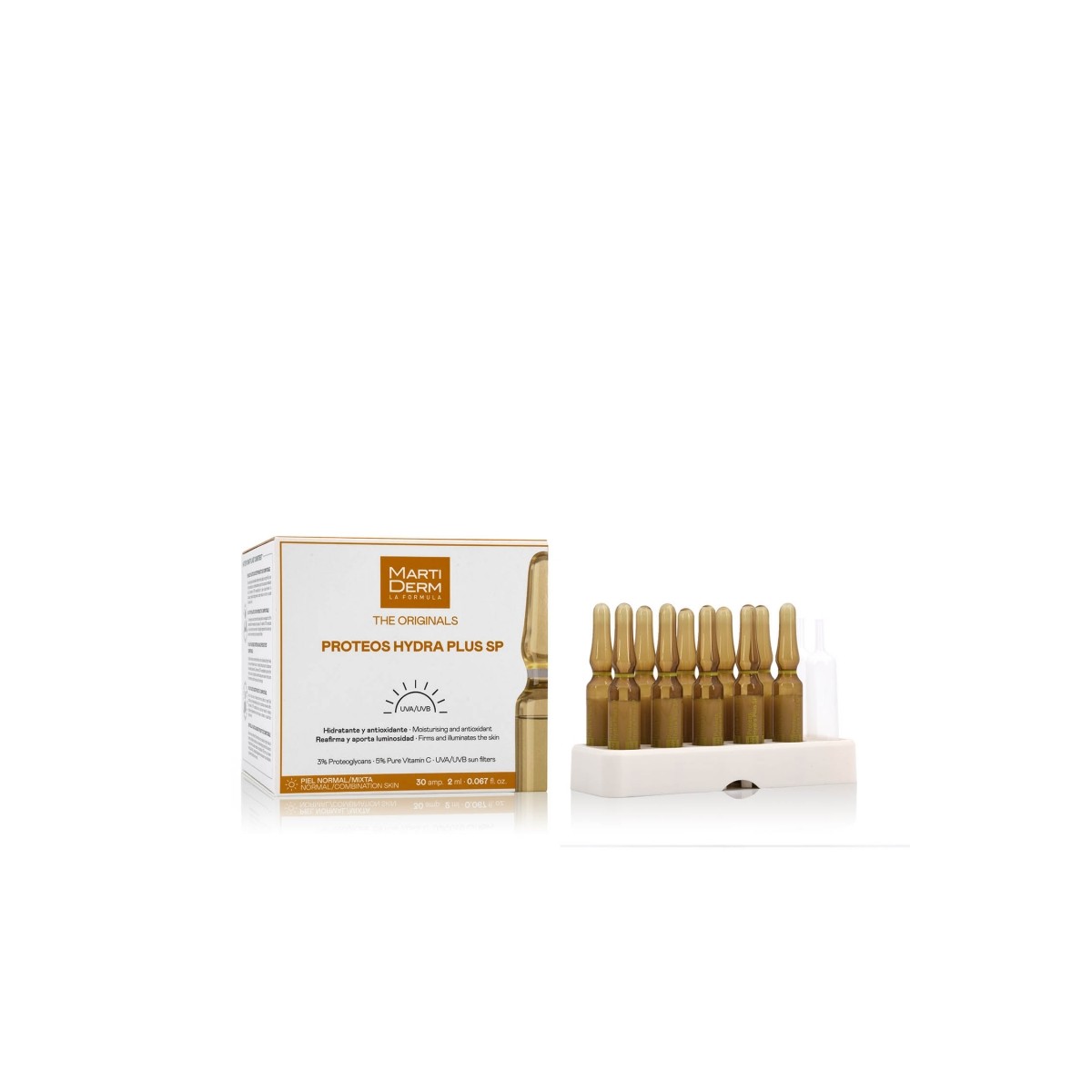 Proteos Hydra Plus Sp Eco Martiderm 30 ampollas: Fórmula hidratante y reafirmante, con proteoglicanos, Vitamina C y FPS, que proporciona luminosidad y ayuda a disminuir las arrugas.